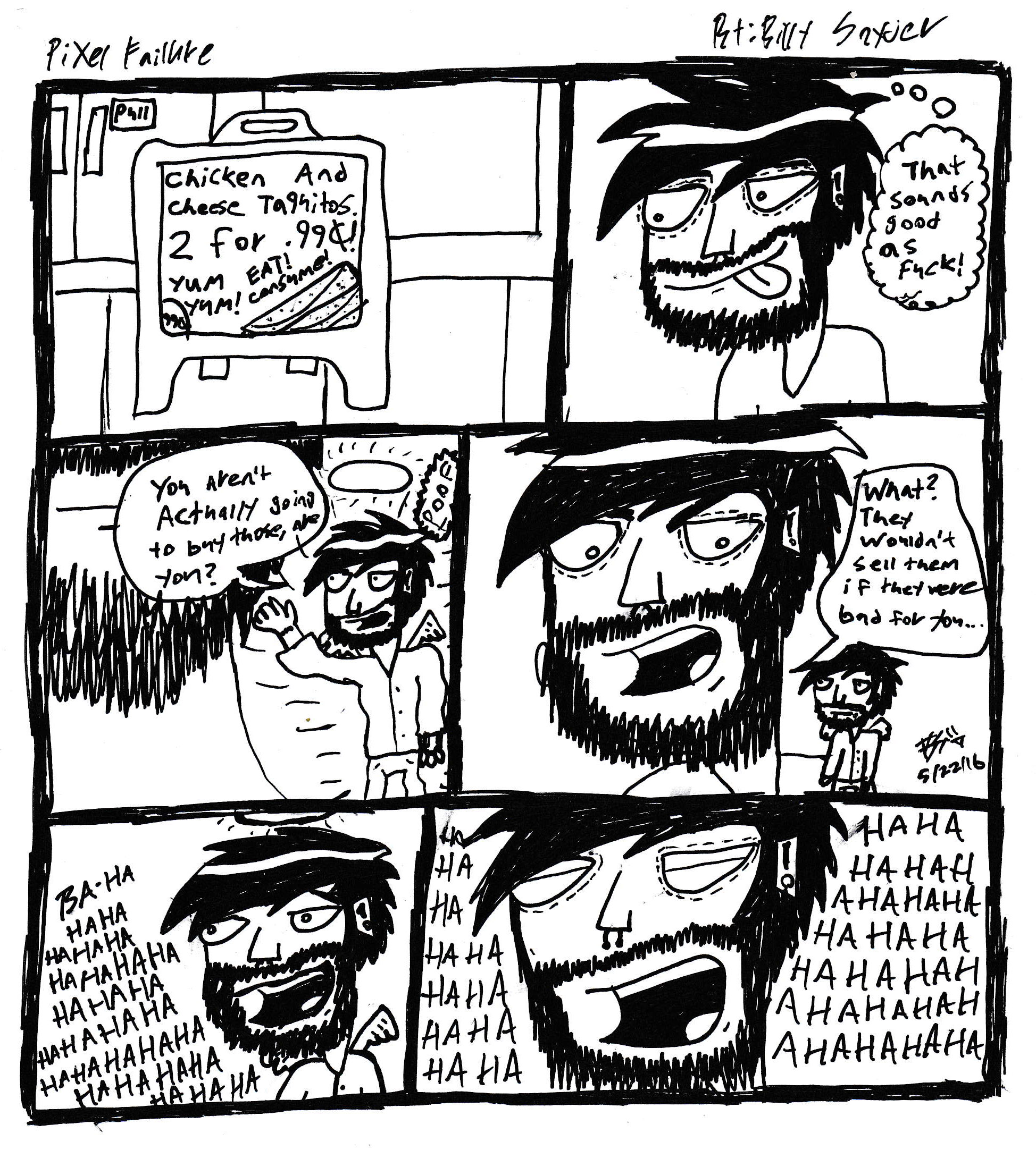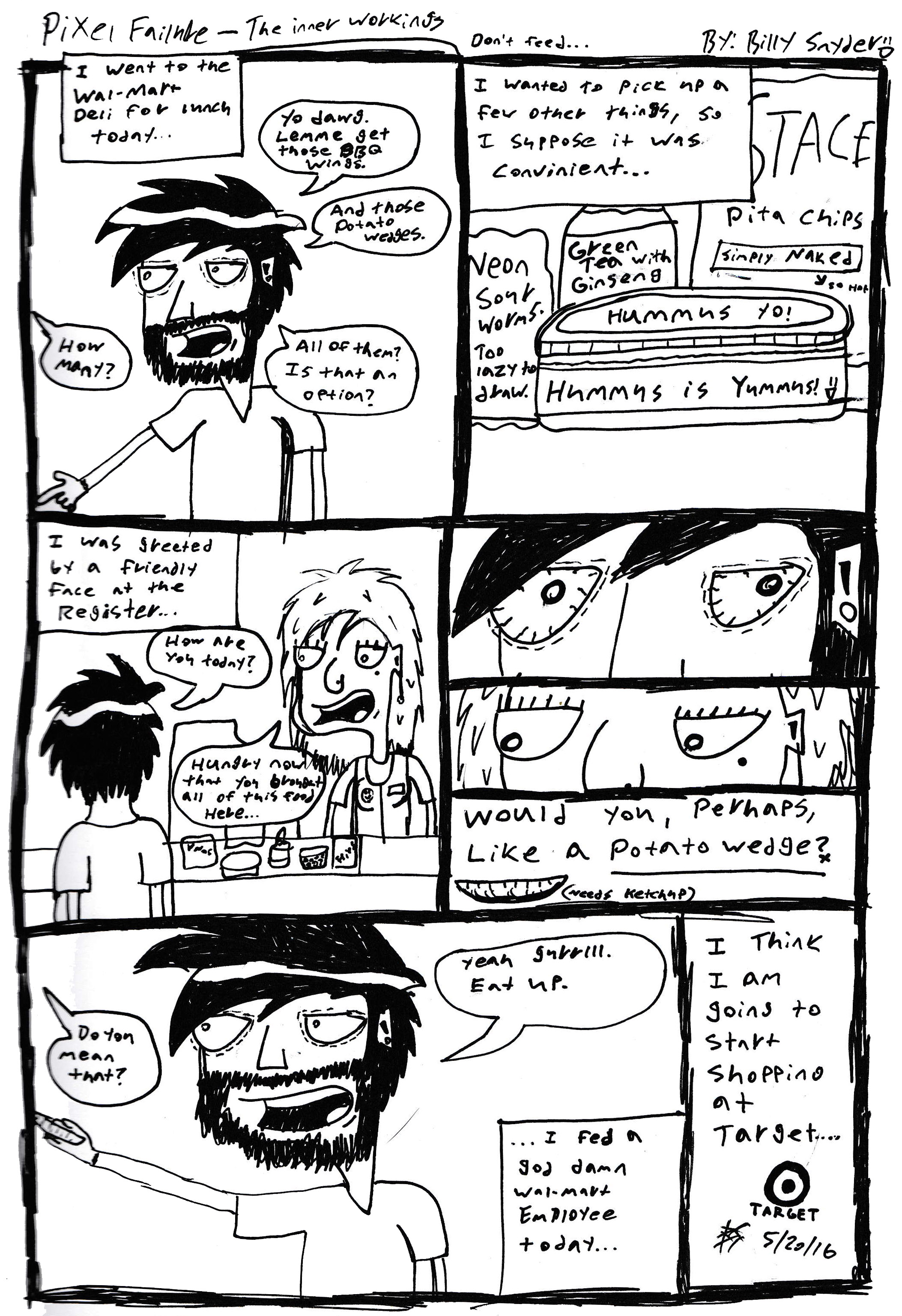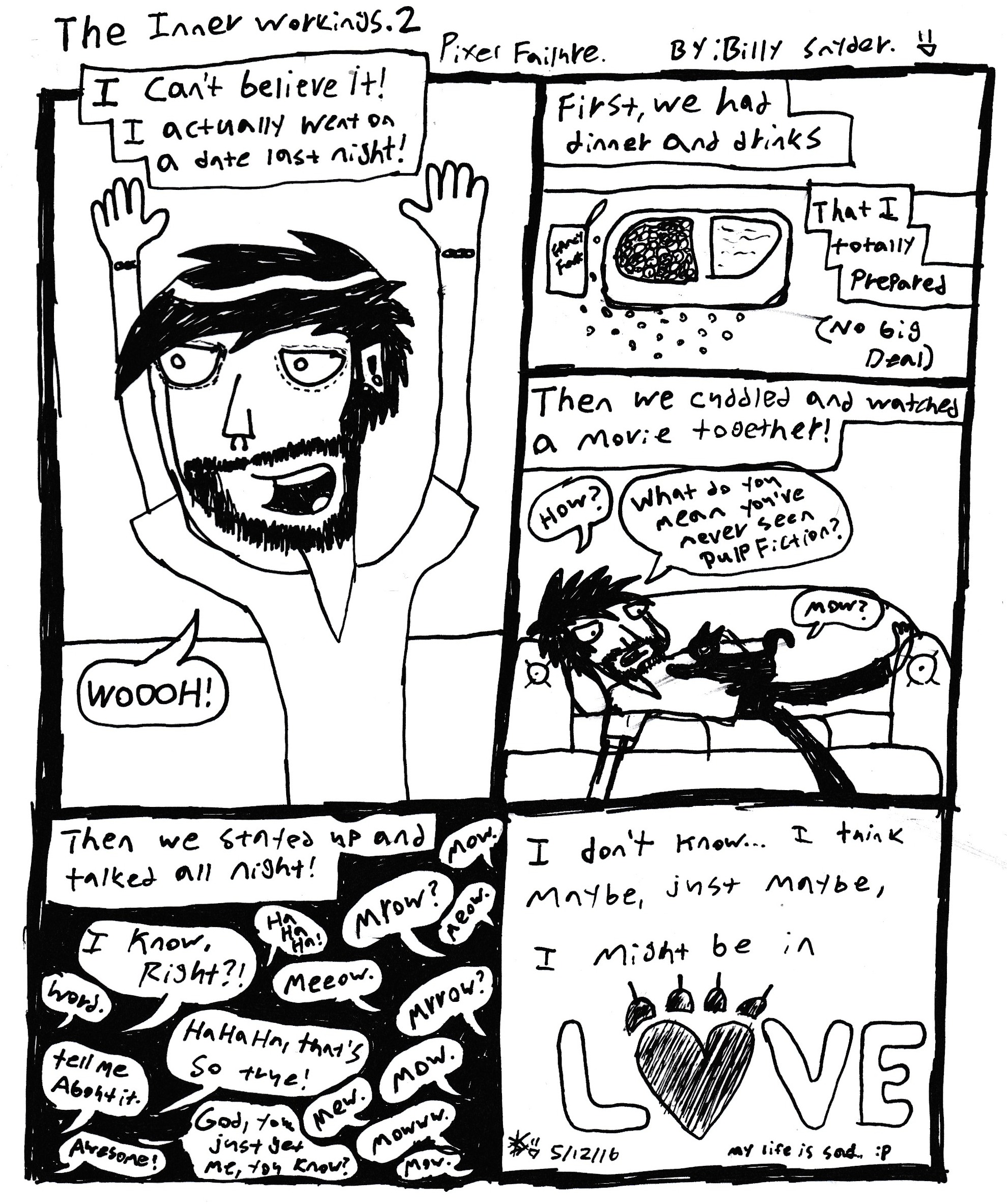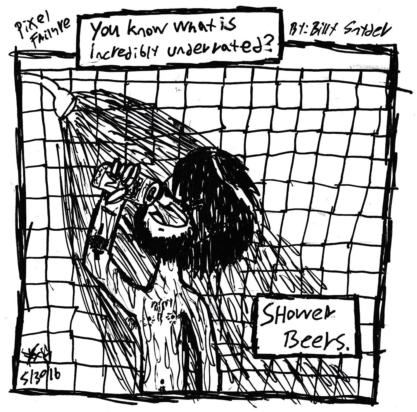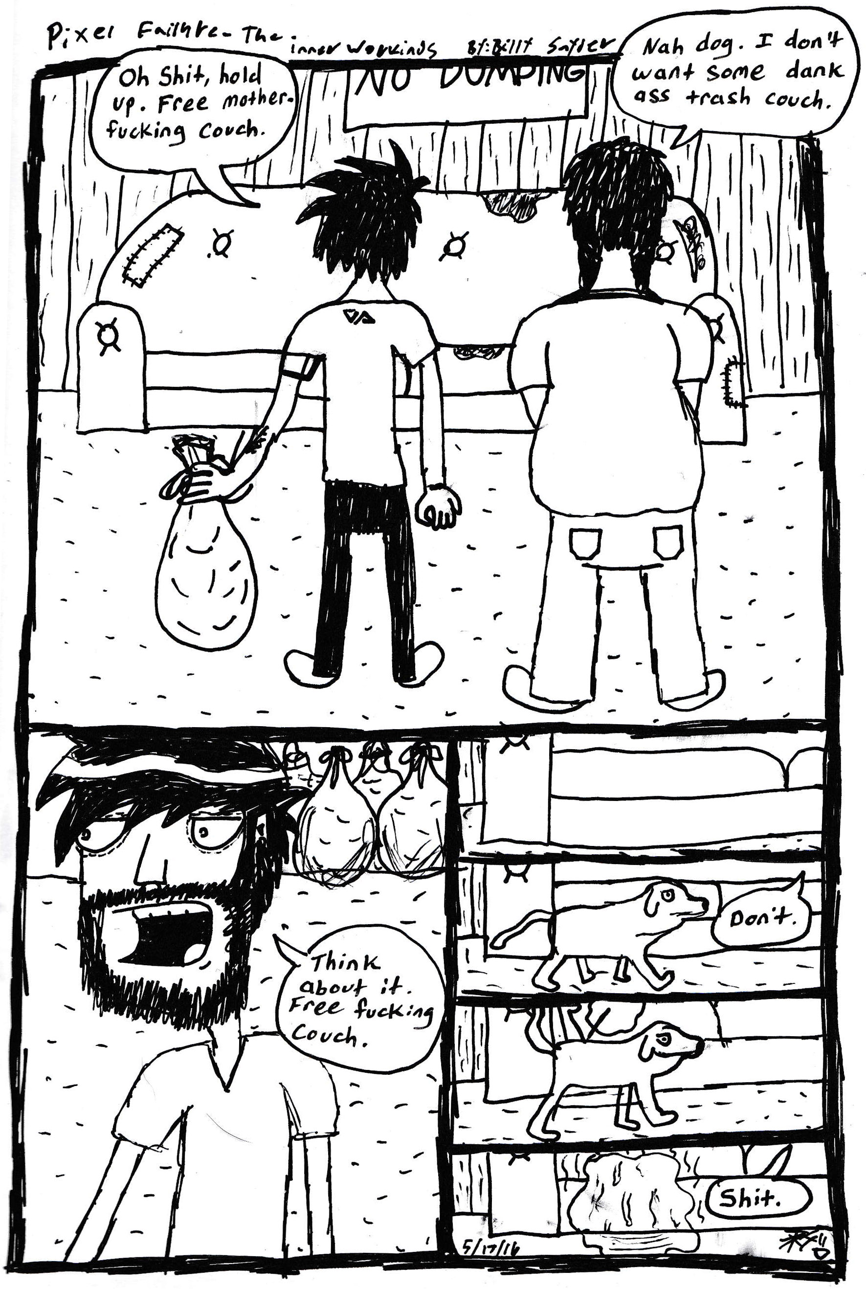 God fucking dammit. I really, really want to start making actual comics regularly again, but alas, there is just not enough time in the days anymore. So, I’ve decided I am going to start uploading little doodles like this that I do from time to time under the title “The Inner Workings”. It’s funny, before I started Pixel Failure what seems like ages ago(Shit, it was actually 7 years ago when I sketched out the first one… and I’ve only finished 30 or so comics? I suck. Haha), I had a few different ideas for webcomics that I was constantly working on. A few I actually made and uploaded to various websites(*shudder*), but most just remain as concepts in my sketchbooks to this day. One of the first comics I ever tried to make was called “The Inner Workings”. You see, growing up I always liked to keep journals, and whenever I was feeling depressed or anxious, I would just jot down everything that was going on in my life at that moment. It may seem silly, but it was just always something that helped me deal with myself in a constructive way. It was also always interesting to go back and re-read old entries, although oftentimes it was embarrassing even to myself. The concept for TIW was simple. It was essentially going to be an illustrated journal based on whatever was going on in my brain at that moment. I sketched out maybe 8-9 comics based on this idea, but I really didn’t like them. They were too symbolic and deep, and honestly just difficult to understand if you weren’t me. I remember showing a few to some friends, and just seeing no reaction because they literally couldn’t understand what was going on in the comic. Literally, one comic involved a home invasion and the protagonist waking up from the loud noise, only to realize he had wet the bed, yelling out “oh no, not again!”, and this was somehow supposed to symbolize relationship troubles… It was convoluted as fuck, obscenely overthought, and it made me feel pretentious when I would say “what do you mean you don’t get it?! It’s so obvious!”(You also have to keep in mind, I was like 15 at the time. Haha.) So, ultimately I scrapped the idea completely, but I always liked the name, and I have always wanted to use it for something… So, here we are. It will be incorporated into PF basically as shorts instead of full fledged comics. Random musings or autobiographical events in my day that I found significant. Instead of a symbolic illustration of a journal entry, I’m thinking they will legitimately just be hastily drawn journal entries, if you will. I don’t know yet, I just had the idea tonight. It makes me excited though, because I really think if I start going this route, I can for one start having a somewhat regular upload schedule again(since they don’t take that much time to scribble down), and two regain my interest in PF, inspiring me to actually buckle down and fucking make comics again.